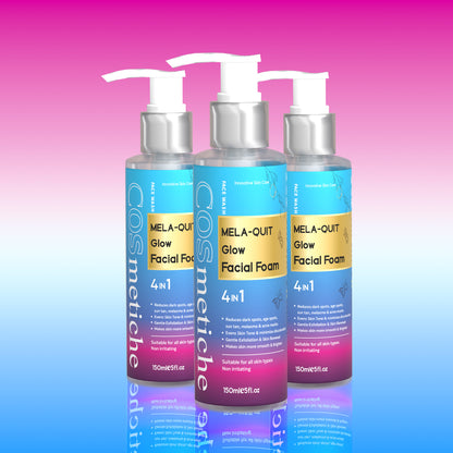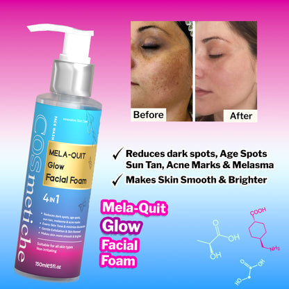 Mela-Quit Glow Facial Foam gently cleanses impurities, brightens dull skin, reduces dark spots, and leaves your face feeling fresh, radiant, and hydrated with every wash for a glowing look